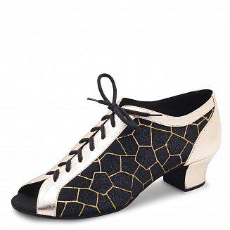 Удобные английские колодки, и устойчивый утолщённый каблук прекрасно подходят для длительных тренировок. Танцевальная обувь для женской практики изготавливается из перфорированной кожи, а также с использованием высокопрочной обувной нейлоновой сетки в качестве дополнительного материала, благодаря чему стопа «дышит» во время тренировок.Основной материал: Кожа "Золото" Материал 2: Атлас чёрный "Кристалло"| Основные | |